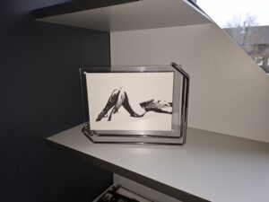 Afdruk op fotopapier, bijzonder ingelijst, liggend of staand zwart frame. De foto zit geklemd tussen 2 acrylplaatjes met kleine magneetjes.