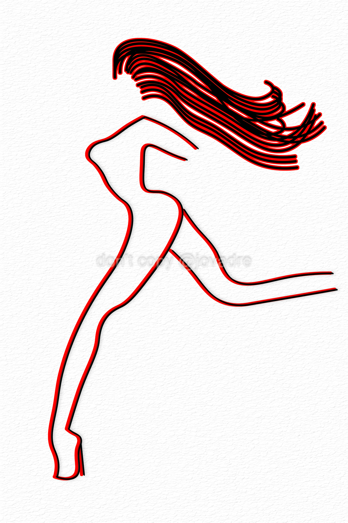 Het figuur, rennen met wapperende haren (Run), is opgebouwd uit zwarte getekende lijnen. Daarna bepaal ik de kleur van de lijnen (rood dus) en de kleur van de achtergrond, in dit geval wit aquarel. De oorspronkelijke zwarte lijnen gebruik ik om schaduwwerking te maken.