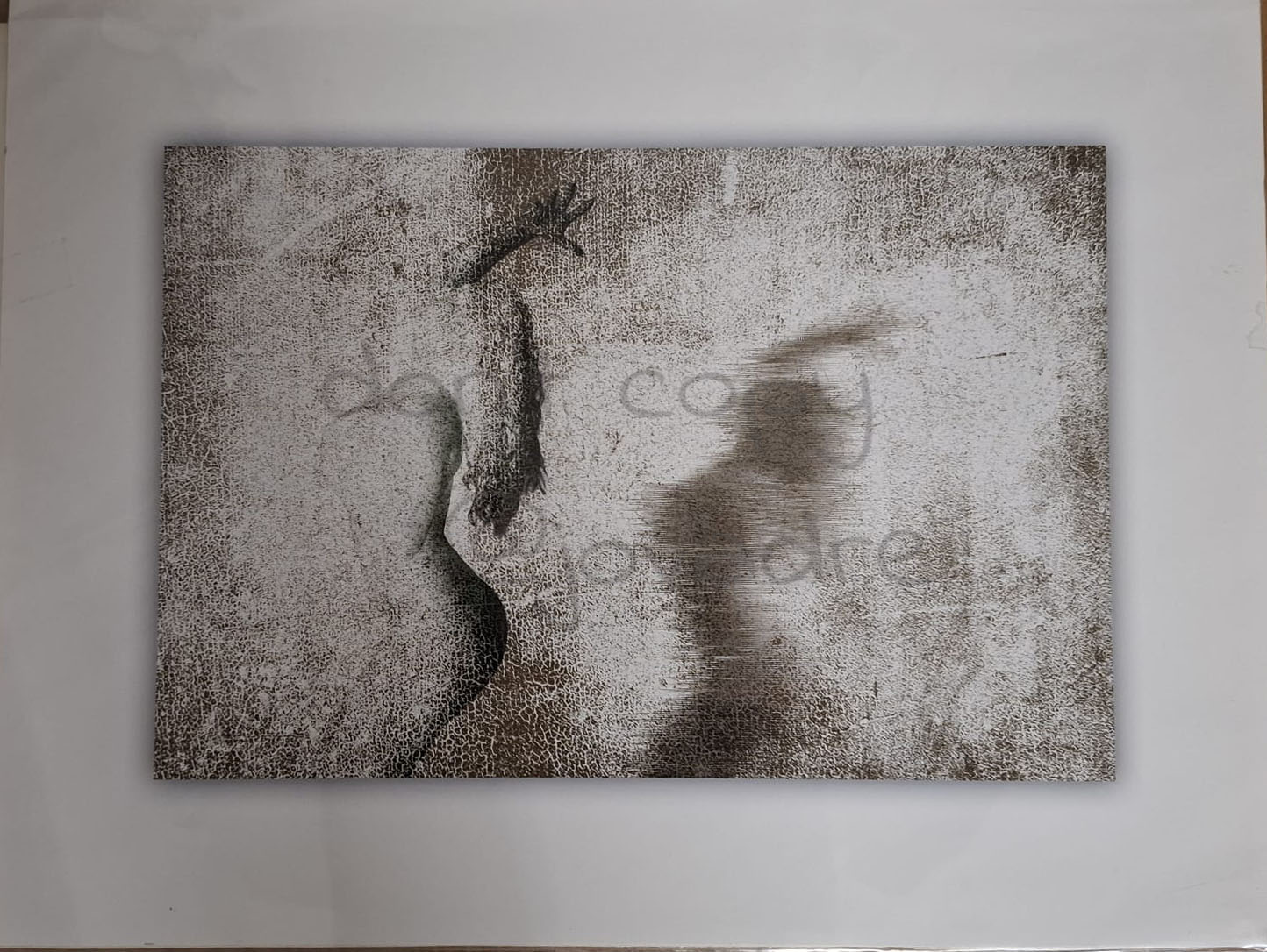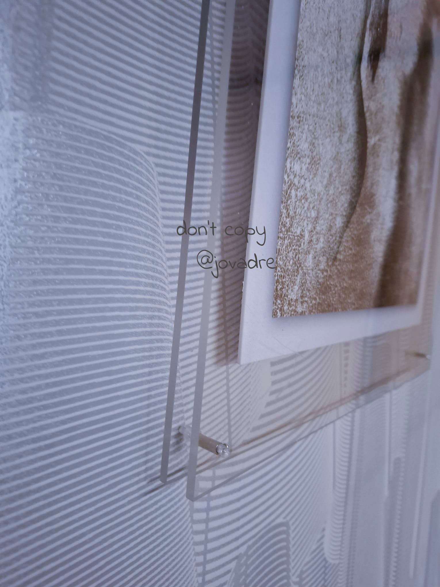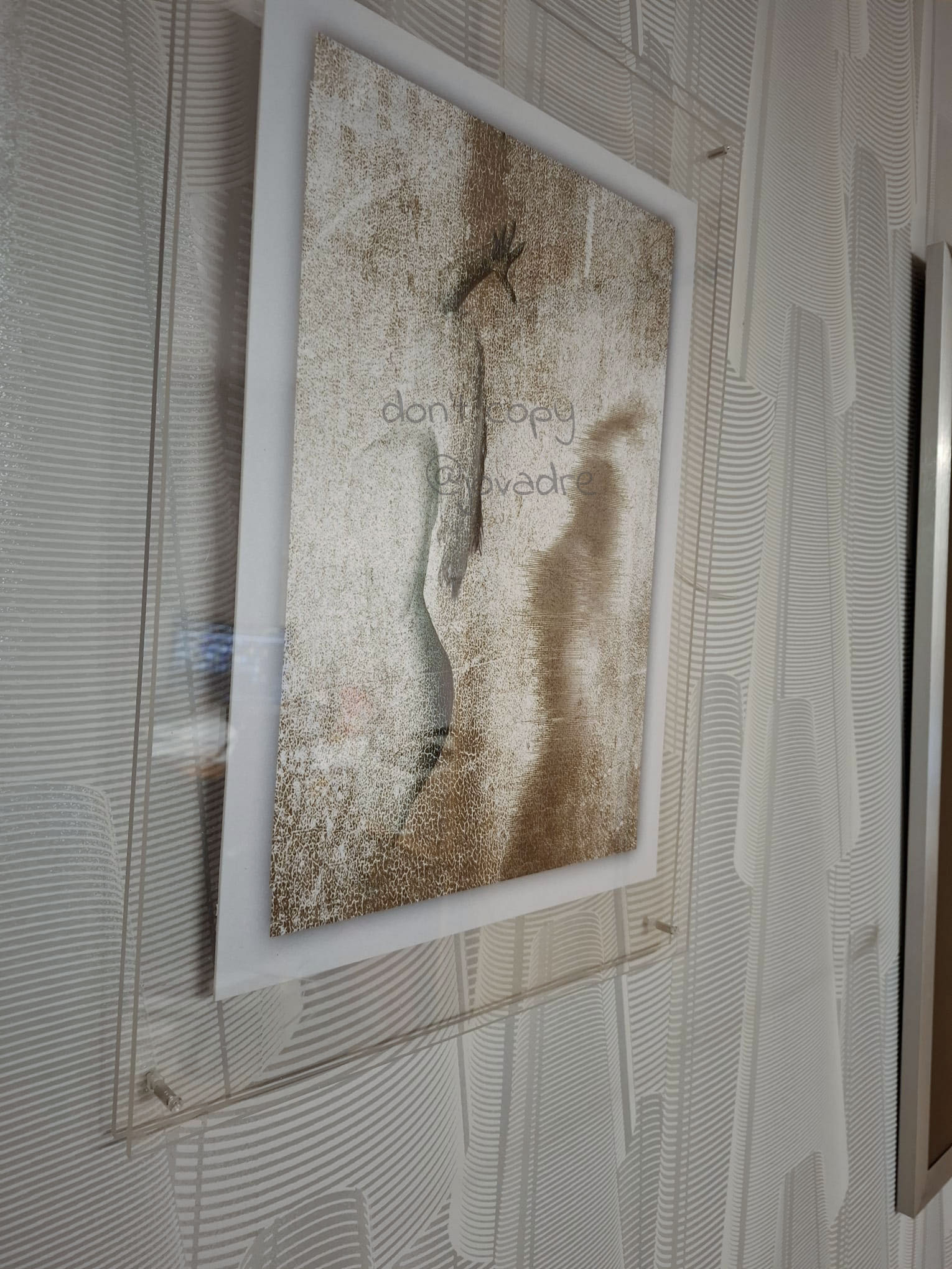 De kleine is een afdruk op 200 grams fotopapier, tussen 2 acrylplaten verlijmd die op ca 3 cm afstand van elkaar verwijderd zijn, verbonden met 4 pinnen. Je ziet het werk hier hangen en ook foto’s van de zijkanten.